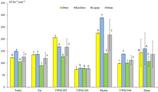 - Stolarski, M.J.; Śnieg, M.; Krzyżaniak, M.; Tworkowski, J.; Szczukowski, S. Short rotation coppices, grasses and other herbaceous crops: Productivity and yield energy value versus 26 genotypes. Biomass and Bioenergy 2018, 119, 109–120. [Google Scholar] [CrossRef]