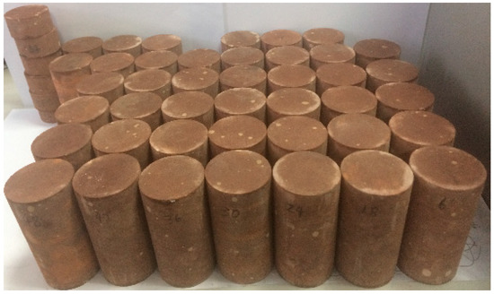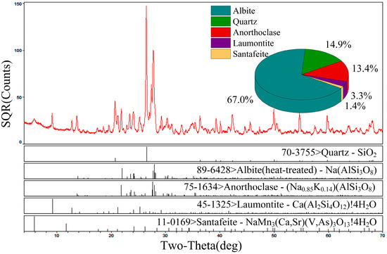 The red sandstone used for the experiments was obtained from an open-pit mine in China, with an average density of 2.41 g/cm3. The standard cylindrical rock specimens (Figure 1) have dimensions of 50 mm (in diameter) × 100 mm (in height) and were prepared with a coring machine, rock saw, and grinder. The main mineral contents (Figure 2) were 67% albite, 14.9% quartz, 13.4% anorthoclase, 3.3% laumontite, and 1.4% santafeite. There were no visible joints or cracks. On the entire rock specimen altitude, the diameter error was below 0.3 mm and the non-parallelism of both ends was below 0.05 mm.