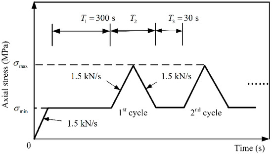 Secondly, the uniaxial cyclic loading and unloading test was carried out by a microprocessor control tester, as shown in Figure 3. We divided 18 red sandstone specimens into 3 groups on average. For each group, the rock specimens were firstly loaded to 20% of the UCS (σc) of red sandstone (σmin) at a loading rate of 1.5 kN/s, then the load was kept constant for 300 s (T1). The axial stress was then loaded at 60%, 70%, or 80% of the UCS (σc) of the red sandstone (σmax) at a loading rate of 1.5 kN/s, then immediately unloading the stress to σmin at a loading rate of 1.5 kN/s and maintaining this state for 30 s (T3), then circulating repeatedly for 100, 200, or 600 times, respectively. Figure 4 illustrates the loading path during the cyclic loading process. Table 1 provides the detailed experimental schemes.