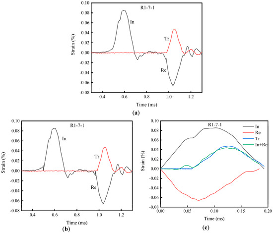 SHPB test wave curve processing contrast diagram (In implies Incident wave, Re implies Reflected wave, Tr implies Transmitted wave): (a) Original wave diagram, (b) wave curve processed with Li’s method [35] and (c) wave curve after a symmetrical wave.