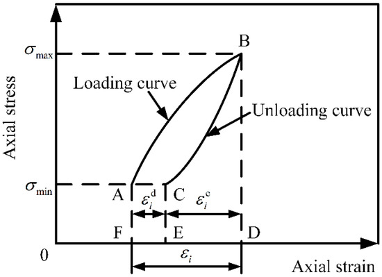 In the uniaxial cyclic loading test, the stress–strain curve of the ith loading and unloading is used to indicate the relationship between the strain energy and dissipated energy. As shown in Figure 7, the loading path is AB and the unloading path is BC. The general strain generated in the rock loading stage is , the recoverable strain released in the unloading process is , and the residual strain is . The residual strain causes rock damage—the plastic deformation energy dissipation. If it is analyzed from the energy perspective, the area circled by the loading curve AB and horizontal axis is the total input energy, , and the area circled by the unloading curve BC and horizontal axis (curve BCEDB) is the unloading recovery strain energy, . The difference between and minus the area of rectangle ACEF () is the energy of the ith uniaxial cyclic loading and unloading energy dissipation. Therefore:
