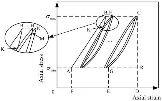 where and are the dissipated energy and input energy of the ith cyclic loading and unloading, respectively; is the energy dissipation ratio of the rock after the ith cyclic loading and unloading; is the damage variable of the rock specimen after experiencing n cyclic loading and unloading events; is the approximate area circled by the curve ABCG (Figure 8); and W is approximately the area circled by the curve ABCDF (Figure 8).