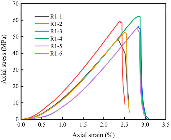 Firstly, six standard-sized cylindrical rock specimens, numbered R1-1 to R1-6, were selected for a uniaxial compressive strength (UCS) test. The objective of the test was to obtain the UCS of the red sandstone specimens. The results would provide the necessary data for the subsequent uniaxial cyclic loading and unloading test and the split Hopkinson pressure bar (SHPB) test.