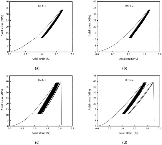 Thirdly, every piece of a rock specimen (Φ50 × 100 mm) subjected to the cyclic loading test was cut into 3 pieces (Φ50 × 25 mm) for the SHPB test. For instance, rock specimen R6-1-1 was cut into three pieces, producing R6-1-1-1, R6-1-1-2, and R6-1-1-3. The detailed test scheme is summarized in Table 2. Some rock specimens that were not subjected to the cyclic loading test (R1-7-1, R1-7-2, R1-7-3, R1-8-1, R1-8-2, and R1-8-3) were selected as the control group. A grinding machine is used to flatten the ends of each specimen to the condition in which the ends of the specimen are flat to 0.02 mm and are not allowed to depart from perpendicularity to the specimen axis by more than 0.001 rad or 0.025 mm in 25 mm. The sides of the specimen are kept smooth, and the abrupt irregularities and straight are limited to 0.02 mm over the full length of the specimen. The ultrasonic velocities of the specimens are measured in order to group the specimens with similar velocities [34].
