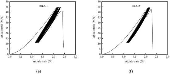 In the cyclic loading test, the peak strain of the rock specimen in the cyclic loading and unloading test has a certain relationship with the cyclic upper limit loading. As exhibited in Table 4 and Figure 10, the uniaxial compressive strength of the rock specimen with a cyclic upper limit load of 60% of σc had no significant damage after circulating 600 times. The uniaxial compressive strength rock specimens with the cyclic upper limit load of 70% of had significant damage after circulating 314 and 358 times. The two uniaxial compressive strength rock specimens, with a cyclic upper limit load of 80% of , suffered significant damage after cycling for 229 times, and 252 times, respectively.