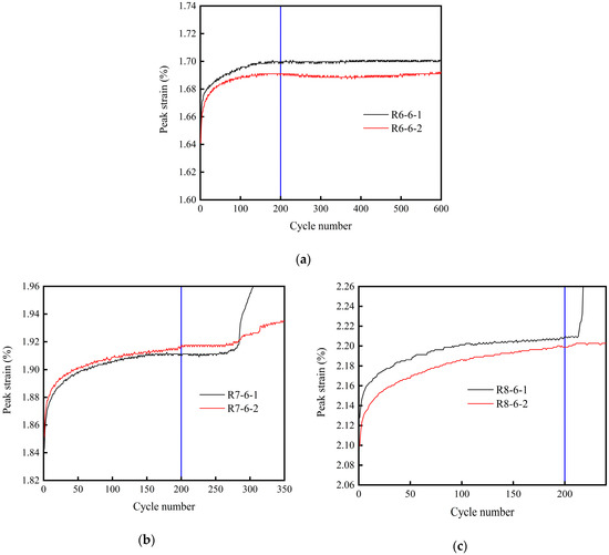 In the uniaxial cyclic loading and unloading experiment, a certain relationship existed between the peak strain of the single cycle and the number of cycles. As shown in Figure 11, the peak strains of the rock specimens under three different loading conditions were statistically analyzed. We found that peak strain of the rock specimen increased obviously as the number of cycles increased in the first 200 circulations, regardless of the upper limit of the cyclic loading and unloading stress, whether 60%, 70%, or 80% of . When the number of cycles was more than 200, the peak strain accumulation rate was almost equal to zero as the number of cycles increased. Therefore, we mainly studied the effects of the first 200 cycles of the loading and unloading tests.