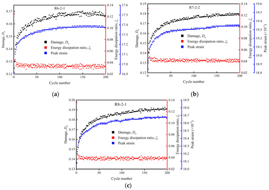 The relationship of the rock specimen damage variable, energy dissipation ratio of a single cycle, peak strain, and cyclic number under three different kinds of stress upper limits in the cyclic loading and unloading test: (a) 60%, (b) 70%, and (c) 80% of .