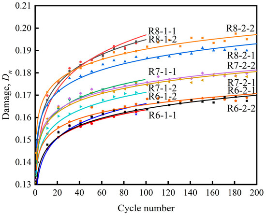 As shown in Figure 13 and Table 5, we statistically analyzed the relationship between the rock specimen damage variable under three different kinds of stress upper limit conditions in the cyclic loading test and the cycle number. We found that the damage variables, , of the rock specimens under 60%, 70%, and 80% of , the three stress upper limits, have a rather significant degree of distinction.
