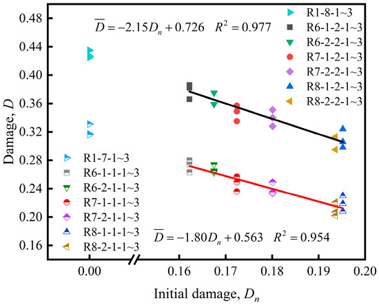 In the SHPB test, the rock specimen was pressed between the incident bar and transmission bar, and the general destruction mode of the rock specimen is tensile splitting failure along the axial direction. The expansion and closing of the microcrack in the rock specimen is the main reason for the change of macromechanical characteristics under external load [41]. For the rock specimens with the initial damage (such as R6-1-1-1), before undergoing the SHPB test, they had already experienced a cyclic loading and unloading test, enabling the original cracks inside the rock specimen to be further expanded, thereby generating new cracks in the test process. In the SHPB test, the cracks in the rock specimen with initial damage further expanded, and even cut though, thereby damaging the specimen. Therefore, under the same impact pressure, the rock specimens with the initial damage were more susceptible to crack penetration than the rock specimen in the control group, namely, the dissipated energy ratio for rock specimens with initial damage is lower than that for rock specimens without initial damage (control group, e.g., R1-7-1), and the damage variable D is defined by the dissipated energy ratio, which gradually decreases as the initial damage increases.