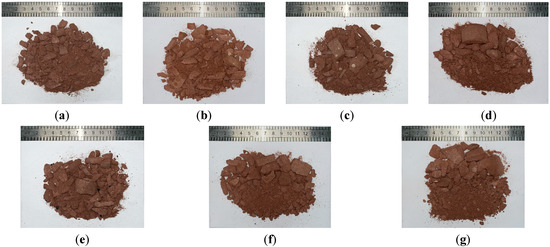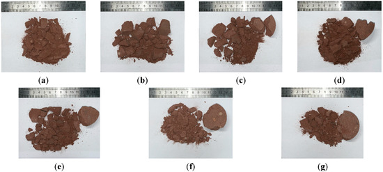 The breakage conditions of the rock specimens under a 0.30 MPa impact pressure in the SHPB test: (a) R1-7-1, (b) R6-1-1-1, (c) R6-2-1-1, (d) R7-1-1-1, (e) R7-2-1-1, (f) R8-1-1-1 and (g) R8-2-1-1.