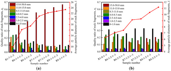 The quality ratio of rock fragments at all levels, , and the average particle diameter of rock fragments, : (a) 0.30 and (b) 0.35 MPa.