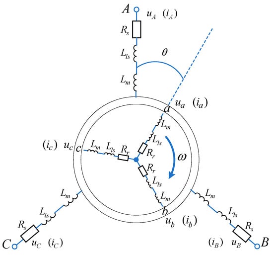 where ,,,, and are the instantaneous values of the stator (A, B, C) and rotor phase (a, b, c) voltages; ,,, , , and are the instantaneous values of the stator (A, B, C) and rotor (a, b, c) phase currents; and ,,,,, are the full flux of each phase winding. and are the resistances of the stator and rotor windings, respectively.