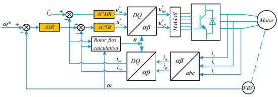 In the above state equations, , , and represent the number of pole pairs of the motor, the load torque, and the rotor time constant, respectively. The coupling between the state variables in Equation (8) causes the nonlinearity of the system [4,10]. The vector control block diagram of the asynchronous motor is shown in Figure 3, in which automatic speed regulator (), the automatic current torque regulator (), and the automatic current magnetic regulator () are the controllers of the vector speed regulation system.