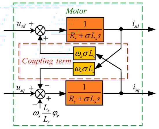 In Equation (8), there is a cross-coupling term in the state equation of the asynchronous motor, thus resulting in the mutual effect of control of the torque component and the excitation component of the stator current, which further affects the dynamic and static performance of the system. The graphical representation of the coupling term is shown in Figure 4. Decoupling can be achieved if the coupling terms are observed and compensated for [19].