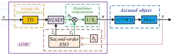 The ADRC consists of a tracking differentiator (TD) [20,21], an extended state observer (ESO) [22,23], and a nonlinear states error feedback control laws (NLSEF) . Among them, the TD can arrange the transition process for the given input, reduce the “impact” of the original error on the system caused by the given mutation, and realize the differential signal extraction; ESO can observe the state variables and total disturbances (unmodeled dynamics and external disturbances) of the controlled object in a real-time manner; and the NLSEF is used to improve the dynamic characteristics of the closed-loop system. The linear ADRC only replaces the nonlinear part of the original controller with the linear part, where the structure of the controller is shown in Figure 5.