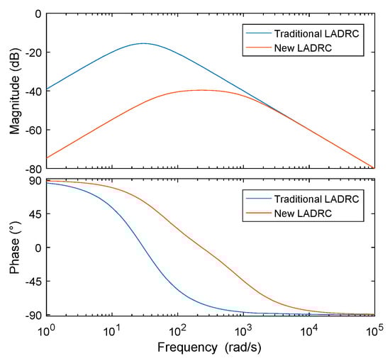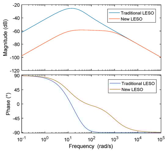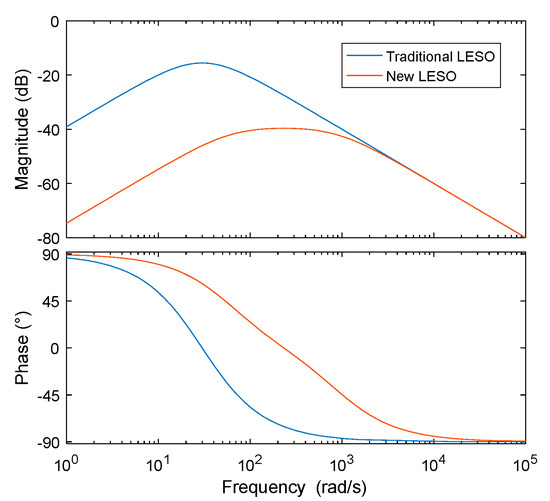 Figure 9 shows the characteristic amplitude and phase–frequency curves for the improved and traditional LESOs. The bandwidth of the improved LESO was higher than that of the traditional LESO, and the phase lag of the intermediate frequency segment was improved. Unlike Figure 9, the improved LESO with the same observer bandwidth in Figure 10 is basically the same as the traditional LESO in the high frequency band, but it has better noise immunity in the low frequency band compared with the traditional LESO, and can more effectively suppress the interference at the input end.