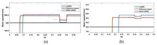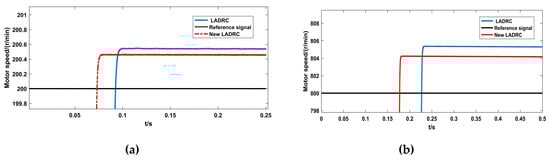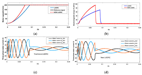 Figure 14a shows the simulation diagram of the no-load starting process of the asynchronous motor with a given reference speed of 200 rev/min. The red curve represents the improved LADRC, while the blue curve represents the traditional LADRC. It can be seen from Figure 14 that the traditional LADRC could reach the given value near the motor speed at 0.1 s, while the improved LADRC could reach the given value near the motor speed at 0.07 s. Therefore, the controller effect of the improved LADRC was better than that of the traditional LADRC.