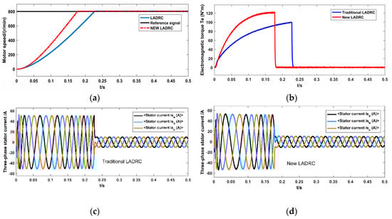 Figure 14c is the simulation diagram of the three-phase stator current when the asynchronous motor started up without a load under the action of the traditional LADRC. After the improved LADRC was adopted, the three-phase stator current reached the steady-state again near 0.09 s, and the motor speed reached the given value. Figure 14d is the simulation diagram of the three-phase stator when the asynchronous motor started up without a load under the action of the improved LADRC. After the improved LADRC was adopted, the three-phase stator current reached the steady-state again near 0.07 s. It can be seen from the simulation diagram of the three-phase stator under the action of two controllers that the dynamic performance of the improved linear observer was better.