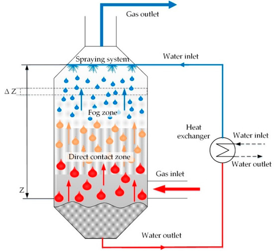 The mathematical model of the fog unit is designed for two-phase (gaseous and liquid) heat and mass transfer process calculations, if heat carriers move in counter flow and there is direct contact between them. Water droplets injected in the upper part of the unit heat up, when they encounter hot gases that are inlet in the bottom part. Water is sprayed with a nozzle in the form of droplets. The flow directions, their interaction, and coordinates in the Z direction are shown in Figure 1.