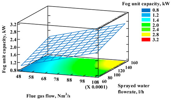 The main results of the data analysis and optimization show that the fog unit capacity has a linear growing trend. However, it is not supported by experimental results, because the fog unit system has its limits regarding water flow rate, becoming less efficient when flow rate used in the experiments exceeds 200 l/h. The response surface graphs for the studied parameters’ range show that water flow rate is another main parameter that contributes to achieving the highest fog unit capacities, along with flue gas flow.