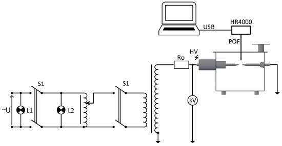 Diagram of the measuring system: Ro—protective water resistor (1.1 MΩ); POF—Polymer Optical Fiber; HR4000—optical spectrophotometer; L1 and L2—control signalling; S1—voltage switch; kV—voltmeter; and U—mains voltage 230 V.