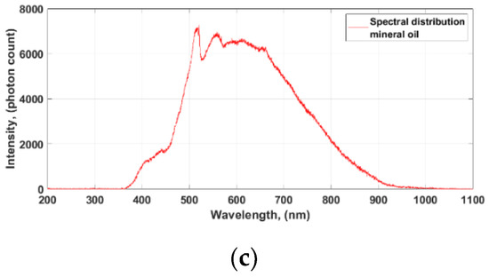 Obtained optical spectra in the needle–electrode system shows some similarity in the shape of the spectral characteristics in all three analyzed liquids. The spectral range of the characteristics mainly includes visible light and, to a small extent, near infrared and ultraviolet. Figure 5 presents examples of registered optical spectra emitted by electrical discharges generated on the surface discharge system for each of the tested insulating liquids.