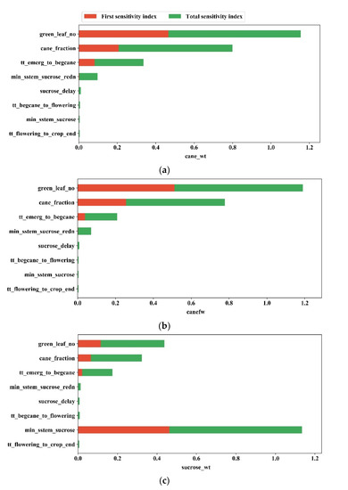 Figure 6a shows that for cane_wt, the first three parameters with the largest first sensitivity index were green_leaf_no, cane_fraction, and tt_emerg_to_begcane, with values of 46.58%, 20.72%, and 8.16%, respectively, and the values of other parameters were less than 1%. The first three parameters with the largest global sensitivity index were the same as the first sensitivity index, with values of 68.93%, 59.22%, and 25.50%, respectively. The global sensitivity index of min_sstem_sucrose_redn was also large, ranking fourth with value of 9.52%, and the remaining parameters were less than 1%. According to Figure 6b, the sensitivity analysis results of canefw were almost the same as that of cane_wt. The first three parameters with the largest first sensitivity index were green_leaf_no, cane_fraction, tt_emerg_to_begcane, with values of 51.19%, 25.56%, and 3.85%, respectively. The first three parameters with the largest global sensitivity index were the same as the first sensitivity index, with values of 67.76%, 52.24%, and 16.97%, respectively. The global sensitivity index of min_sstem_sucrose_redn was also large, ranking fourth with value of 6.86%, and the remaining parameters were less than 1%. According to Figure 6c, for sucrose_wt, the first four parameters with the largest first sensitivity index were min_sstem_sucrose, green_leaf_no, cane_fraction, tt_emerg_to_begcane, with values of 46.27%, 11.50%, 6.51% and 2.12%, respectively, and other parameters were less than 1%. The first four parameters with the largest total sensitivity index were the same as the first sensitivity index, with values of 67.19%, 32.20%, 25.79%, 15.28%, respectively, and other parameters were less than 1%. Figure 6d shows that for lai_sum, the first three parameters with the largest first sensitivity index were cane_fraction, green_leaf_no, tt_emerg_to_begcane, with values of 60.85%, 30.18%, and 8.85%, respectively, and other parameters were less than 1%. The first three parameters with the largest global sensitivity index were the same as the first sensitivity index, with values of 65.80%, 31.62%, and 13.79%, respectively. The global sensitivity index of min_sstem_sucrose_redn ranked fourth with value of 1.71%, and the remaining parameters were less than 1%.