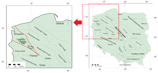 Location of the study area on the background map of the main tectonic units of Poland on the sub-Cenozoic surface [54].