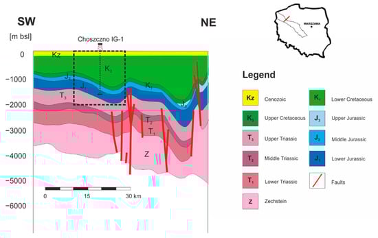 The lithostratigraphic profile of the Szczecin Through is built of partially eroded and folded Carboniferous-Devonian deposits covered with Rotliegend, Zechstein, and Mesozoic deposits. The most promising groundwater horizons occurs in the Lower Jurassic sandstones, mostly Hettangian and Sinemurian. Pliensbachian and Upper Toarcian deposits have less favorable reservoir parameters [20,21].