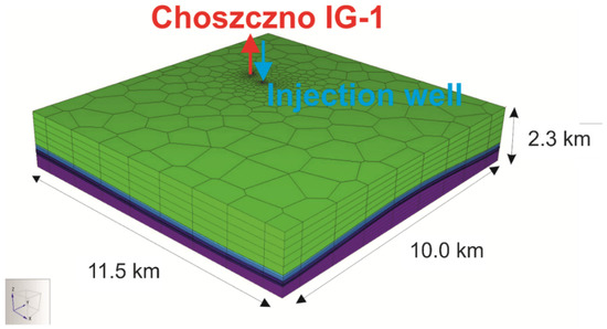 The numerical model covered the area of 11.5 × 10.0 × 2.3 km (Figure 3). The geothermal doublet was based upon the archival information from the Choszczno IG-1 well, which was defined in the model as the production well. In this section a mathematical model of the whole system is presented also. Governing equations for fluids are strictly connected with the elementary balance of mass, momentum, and energy. However, the governing equation in solids is focused on the balance of energy. For porous rocks in the governing equations, porosity should be considered. In addition, the porosity of rocks, as follows: , is considered in governing equations. Typically, for each geological formation the values of rock porosity are the factors that take into account the amounts of fluid volume in respect to the whole volume of rocks formation . This paper uses the traditional system of equations for numerical modelling, namely [62,63]: