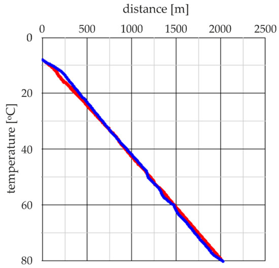 Results of calibration of numerical model. Red line—the measured value for the Choszczno IG-1 well, blue line—the estimated value.