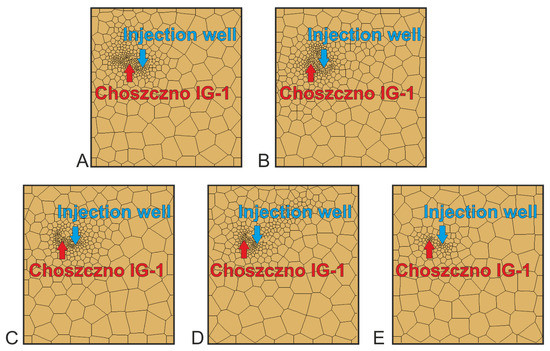 Also, the issues concerning the generation of the discretization grid and its usefulness for modelling various physical phenomena have been developed in recent years, which is evidenced by a number of works [79,80,81,82]. Therefore, it was based on previous works on mesh for TOUGH2 code and prepared the grid as follows. The number of elements with defined volume is determined, as well as the method of connection between elements, enabling the creation of regular or irregular one-, two-, or three-dimensional interpolation meshes. Time discretization occurs by determining the number of simulation steps and can also apply to its total duration. Intervals for individual simulation steps were automatically selected by the simulator. Numerical simulations were conducted in PetraSim, which uses TOUGH code for the calculating process. Density of computational grid was changed by the maximum area near the wells located in the Choszczno Region, but without any changes in number of grid elements that equals 1616 elements.