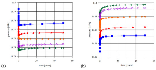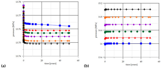 For changes in the distance between the boreholes (Figure 7), in the case of pressure changes in the production borehole zone, the increase from 13.749 MPa (for 3000 m) to 13.762 MPa (for 500 m), was observed (change at the level of 0.1%). The opposite situation was observed in the injection borehole, where the pressure increased from 14.001 MPa (for 500 m) to 15.018 MPa (for 3000 m) (change at the level of 7%). It should be emphasized that the depth of the injection borehole also changes with the distance. Pressure stabilization is visible between first and second years of system operation. Taking into account the obtained results for the assumed yield (120 m3/h) and temperature of the injected waters (25 °C) for a period of 50 years in the distance range of 1000 to 3000 m between borehole, it is possible to exploit geothermal waters without the risk of cooling groundwater horizon. In the case of 500 m distance the temperature in production well zone drop up to 1.6 °C; however, it is still not large enough to cause significant cooling of the water horizons in the assumed time of exploitation.