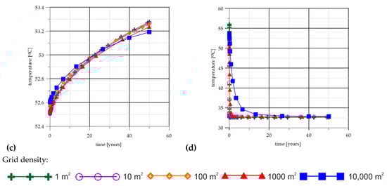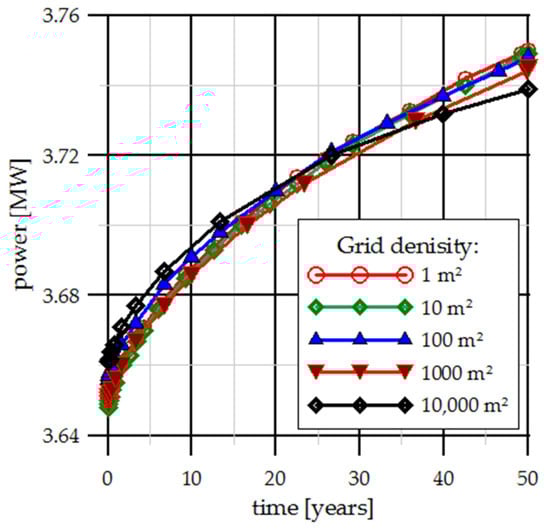 Based on results in Figure 6, it can be observed that for density from 1 to 100 m2 estimated values are similar. The most visible differences are visible for the density between 1000–10,000 m2. Furthermore, taking into consideration the simulation time, which increases with increasing density, for 1 m2 time is approximately 4 times longer than for 100 m2 density. For further calculations, the 100 m2 density was assumed as the most effective for the Choszczno region. Presented and preceding published [98] tests allowed to choose the numerical grid to ensure that further refinement insignificantly influence the temperatures and pressures variation in time. Since then, several simulations have been carried out, which affected the final density of the grid. Therefore, computational results for 100 m2 density can be treated as mesh independent.