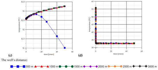 At the second stage of the simulation, the distance between production and injection wells in ranges of: 3000, 2500, 2000, 1500, 1000, 500 m (Figure 7), was analyzed. Pressure in the production borehole zone changes from 13.749 MPa (for 3 000 m) to 13.762 MPa (for 500 m), while in the injection well pressure increased from 14.001 MPa (for 500 m) to 15.018 MPa (for 3000 m). The temperature of the injected water for a period of 50 years in the distance range of 1000 to 3000 m between wells is stable, only for the distance range of 500 m the temperature in production well zone drops up to 1.6 °C (Figure 7). The obtained results were compared with the results of other analyses carried out for the research area in recent years [20,21,36]. The results were also referred to the parameters of geothermal heating plants located in Stargard and Pyrzyce, in a short distance from the research area. In both cases it was confirmed that they are correct.
