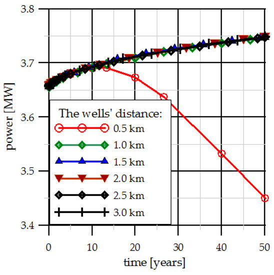 In the case of power generation based on the obtained results only for the distance of 500 m, thermal power is reduced after the 10th year of exploitation (Figure 9). For other variants (when the distance equals at least 1 km), it might be noticed that the distance between wells does not influence the thermal power of the doublet and the received amount of energy (Figure 9 and Table 2).