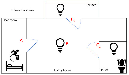 Plan4Act [10] is a European project to proactively predict the future planned actions of an agent by extracting this planning knowledge from the agent’s neuronal activities. The basis for this is recent experimental results that show that complex planning and sequencing information is represented by neural activity in the (monkey) brain [31,32]. These investigations are further extended and transferred to a BMI setup in terms of a wearable or Medical Internet of Things (IoT) edge device for controlling devices with more foresight than in currently existing systems. Therefore, through the development of such a proactive BMI edge device, a future path for people with disabilities to interact with their (smart) environment in a more robust way is opened up for the first time. Figure 1 shows a scenario considered in the Plan4Act: a motor-impaired patient initiates a thought to go to the toilet from the bedroom; A denotes the action to open the door of the bedroom; B is the action to turn on the light of the living room; C1 denotes the action to open the door and turn on the light in the toilet; and C2 represents the action to open the door and turn on the light on the terrace. Action sequences AB may lead to the different following actions C1 or C2, since the common path is AB.