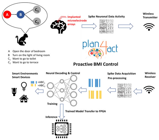 We thank Jan-Matthias Braun, and Ricardo Rodrigues do Carmo for supporting the work in the dataset generation of neuronal signals for BMI proactive control experiments. We also thank Alexander Gail and his team from the Sensorimotor Group of Deutsches Primatenzentrum GmbH (DPZ) for providing neuronal signals and the image of Spike Neuronal Data Activity in Figure 2 and discussion on the Proactive BMI control scenario in Figure 1, Sergio Guillen Barrionuevo and his team from MYSPHERA S.L. for providing the image of Neural Decoding & Control in Figure 2, Florentin Wörgötter, Christian Tetzlaff and their team for their fruitful discussions of the Plan4Act control scenario and the Plan4Act system architecture, and María Teresa Arredondo Waldmeyer and her team from Life Supporting Technologies (LifeSTech) at Technical University of Madrid (UPM) for technical discussion on the FPGA interface to smart home devices. Finally, we thank the Plan4Act project’s team members for the overall project concept development and general technical discussion.