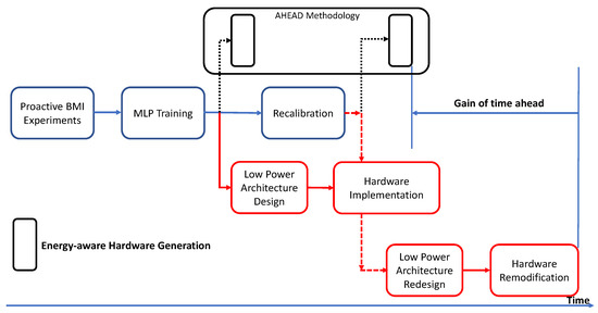 The hurdles to the development of proactive BMI control edge devices on FPGA are achieving low power consumption and meeting the reconfigurable requirement of the MLP hardware configuration due to the need for portable edge devices and BMI recalibration, respectively. As indicated in the literature [29], it takes much effort and resources from the hardware team to modify or even redesign the low-power MLP hardware accelerator because of the induced specification change. Moreover, the analysis of fixed-point bit-widths is a tedious and labor-intensive task [24,27] which must be executed by either the software team or hardware team. Instead, the AHEAD methodology tackles the issue by automating the complete fixed-point hardware analysis to digital design flow in order to reduce the development efforts and time of redesign, reverification, and reimplementation. Thus, it can have a rapid hardware update for the BMI edge devices on FPGA due to BMI recalibration.