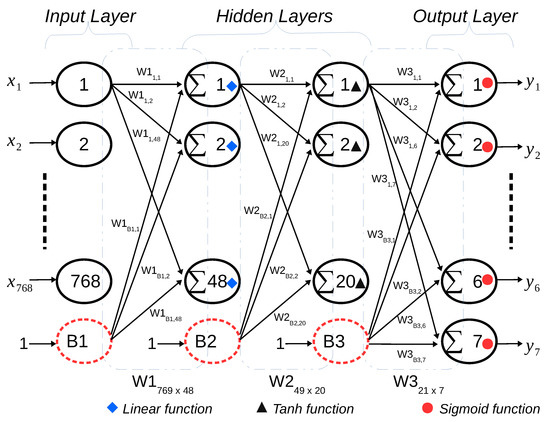 Figure 4 demonstrates a four-layer, fully connected MLP with 768 neurons in the input layer, 48 neurons in the 1st hidden layer, 20 neurons in the 2nd hidden layer, and seven neurons in the output layer, denoted as 768-48-20-7. The linear, hyperbolic tangent, and sigmoid activation functions are applied in hidden layer one, hidden layer two, and the output layer, respectively.