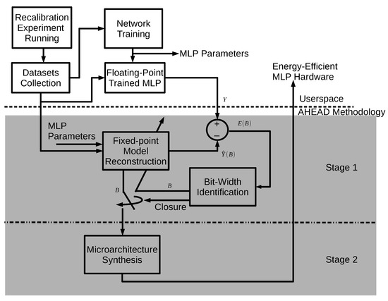To address the aforementioned challenges, an automatic holistic energy-aware design (AHEAD) methodology is introduced for the design automation of an energy-efficient neural network decoder for the proactive BMI. The core processing component of the neural network decoder is a multilayer perceptron [18] (MLP) inference that has features of uniformity, innate parallelism, scalability, dynamically adaptivity, and fault tolerance [19,20,21]. The MLP will be trained by the golden datasets for the initial weights. AHEAD extracts the network feature from MLP and creates the corresponding hardware model and test bench. AHEAD adopts fixed-point number representation for the hardware implementation of the MLP because of the comparable accuracy in finite-precision performance [22], shorter latency, reduction of logic, memory area, and power consumption on an FPGA [17,23] compared to its floating-point implementation. Since the floating-point to fixed-point conversion is a nonconvex NP-hard optimization problem [24] and requires language-specific programs [25,26,27,28], AHEAD develops a bit-width identification (BWID) loop method for the tedious conversion because of the close synergy between fixed-point parameter estimation and configurable hardware generation. The BWID automatically estimates the required fixed-point bit-width parameters with the least loss of accuracy and bit-width through the reconstruction of the given MLP neural network from the MLP parameters and golden datasets without the user’s program code. To simplify and accelerate the system implementation on an FPGA, AHEAD encompasses a high-level synthesis (HLS) [29] design flow that automatically generates a register-transfer level (RTL) for the PPA-optimized system with fixed-point bit-width MLP, pipelines, and parallel low-power microarchitectures.