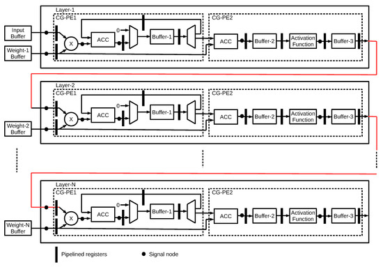 Parallel architecture is adopted for both CG-PE1 and CG-PE2 to increase the throughput. Furthermore, the highly parallel architecture takes advantage of the higher throughput to trade-off a reduction in the voltage and clock frequency for lower power at the cost of an extra amount of area [33]. To achieve the goal, the number of multiplier and accumulation units are parameterizable, which gives run-time flexibility for configuration. In addition, the pipeline architecture is introduced to help reduce computation latency among different operation units by boosting the hardware utilization rate. The input data and weight matrix are placed at the input buffer and weight memory, respectively. They are connected to the on-chip AXI bus and can be programmed by any master on the bus. All storage elements, such as memory or buffer, are implemented by either registers or partitioned on-chip memories with configurable parameters to increase the memory bandwidth.