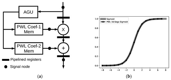Hardware implementation of PWL approximated function for hyperbolic tangent and sigmoid. (a) Microarchitecture of the piecewise-linear (PWL) approximation function. AGU—address generation unit. (b) Output comparison of the PWL 16-segments sigmoid and original sigmoid function.