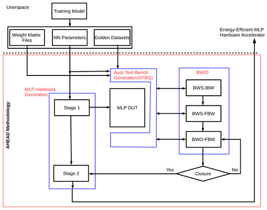 This section describes key implementation details of the AHEAD methodology, including three major components: MLP hardware generation, automatic test bench generation (ATBG), and bit-width identification (BWID). The complete implementation of the data and control flow with the building blocks for the AHEAD methodology is detailed in Figure 9.