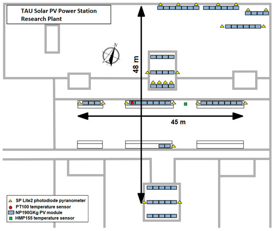 This study is based on irradiance measurements from an array of pyranometers and ambient and PV panel temperature measurements. The measurements were done at the solar PV research power plant at the rooftop of Tampere University in Finland in Northern Europe [18]. The data were collected between 1 May and 31 August from 2016 to 2018. The solar noon at the research plant is approximately 12:25 (UTC + 2), but because the power plant and PV panels are facing 23° east from due south, the panels are facing the sun around 11:20. Because of nearby trees and building structures, some of the irradiance sensors are shaded during early morning hours. The locations of the PV panels, the dimensions of the PV generator, and the locations of the pyranometers and the temperature sensor are presented in Figure 1.