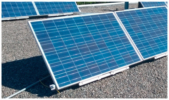 Figure 2 presents the installation arrangement of the PV panels and location of one of the pyranometers. The PV panels are installed at a fixed 45° tilt angle. The irradiance was measured with photodiode-based pyranometers (Kipp & Zonen SP Lite 2), which were mounted to the frames of the PV panels. Because the pyranometers have fast response time (<500 ns to 90%), wide measurement range (up to 2000 W/m2), and high sampling frequency (10 Hz), the irradiance measurement data are well-suited when simulating the actual operation of a PV generator. The temperature of the PV panel was measured with a PT100 thermocouple pressed against the backside of the PV panel, providing the PV cell temperature with good accuracy. The gap between the PV panel front end and the rooftop is small, which reduces the cooling of the PV panels on windy days. The ambient temperature sensor (HMP155, Vaisala, Vantaa, Finland) was mounted on a pole a few meters above the rooftop in the center of the research power plant.