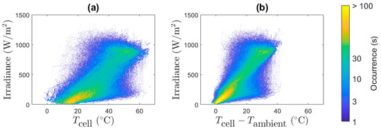 Occurrence of (a) irradiance and PV cell temperature Tcell, and (b) irradiance and the difference between Tcell and the ambient temperature Tambient during the observation period in one PV panel.