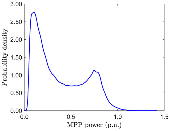 The probability density distribution of the MPP power of the studied PV generator is shown in Figure 6. For the analysis, we included only the operating points where the MPP power is more than 5% of the PV generator nominal power. The MPP power probability density plot has two distinct peaks: first in a low power region due to early morning, late evening, and shade periods; and second at 0.75 p.u., which is due to clear sky periods during peak production hours. The MPP power exceeds the nominal STC power only 0.46% of the time and the maximum MPP power is 1.42 p.u. (45.2 kW) due to the cloud enhancement phenomenon. With a DC-to-AC power ratio of 1.0, the system is operating in power-limiting mode only due to the overpower events, but with increasing DC-to-AC power ratio, power limiting becomes more frequent.