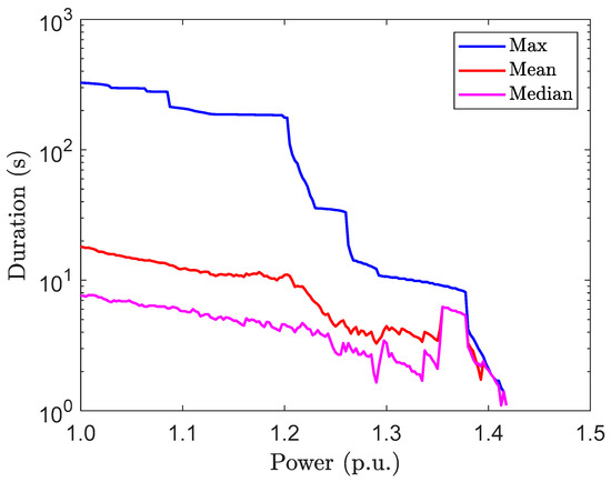 The duration of overpower events exceeding a certain power value as compared to the nominal power in STC is presented Figure 8. Maximum, mean, and median duration of the overpower events decrease with increasing power value. Overpower events can last for several minutes, but the average duration is only some seconds. This is in line with the previously published results on overirradiance events [3,4]. The steplike behavior of the maximum duration curve is due to single overpower events, which have the longest duration within certain power ranges. The increase in mean and median durations at high power is due to one long-lasting event out of two to four events.