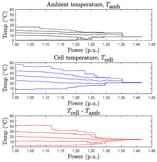 Maximum (100%), 90%, 50%, 10%, and minimum (0%) percentile values (from top to bottom) of the ambient temperature, the PV panel temperature, and the temperature difference between the PV panel and the ambient air during the overpower events, as a function of PV generator power.